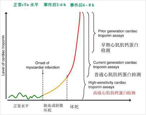 过去将近10多年的时间里,心肌肌钙蛋白检测的灵敏度一直被不断提高,高敏肌钙蛋白的概念应运而生。 高敏肌钙蛋白作为一种高敏感的检测指标,有助于探查既往易被漏诊的微小心肌损伤,HS-cTn可在心肌损伤后1~3h就检测到有临床意义的增高,可比传统方法提早3~6h,与普通cTn检测相比,高敏肌钙蛋白检测对心肌梗死有较高的预测价值,可减少肌钙蛋白盲区时间,更早地检测急性心肌梗死。使用高敏肌钙蛋白可以在症状出现的1-3小时内诊断ACS,改善5%的非ST段抬高急性冠脉综合征患者结局。同时,HS-cTn更合理筛查心血管高危患者,优化临床治疗决策与预后评估。
